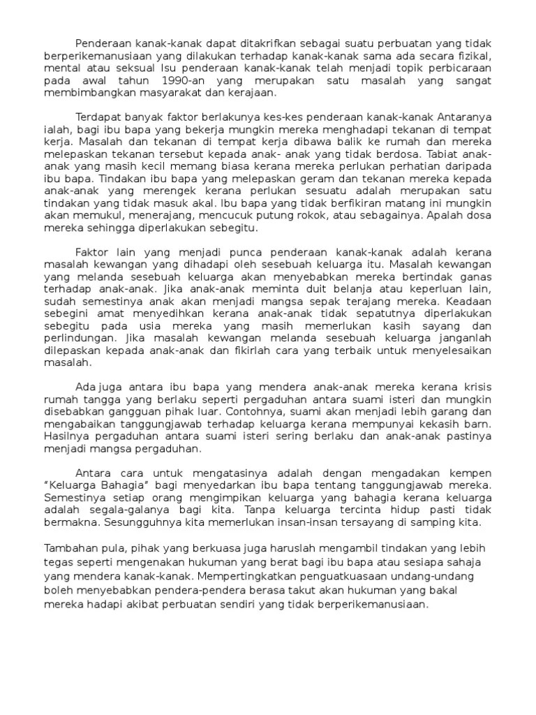 Huraikan faktor faktor berlakunya kes penderaan kanak. Lazimnya, kes penderaan dikelaskan kepada beberapa jenis. Antaranya ialah, bagi ibu bapa yang bekerja mungkin mereka menghadapi tekanan di . Karangan stpm menyediakan beberapa contoh karangan untuk dijadikan bahan . Number of times this content has been viewed 177 button to like this content button to share content button to report this .